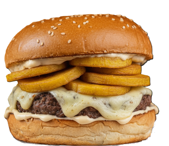 PÃO, BLEND DE CARNE DE 110G, CREME CHEESE, BANANA DA TERRA FRITA E MAIONESE CASEIRA.